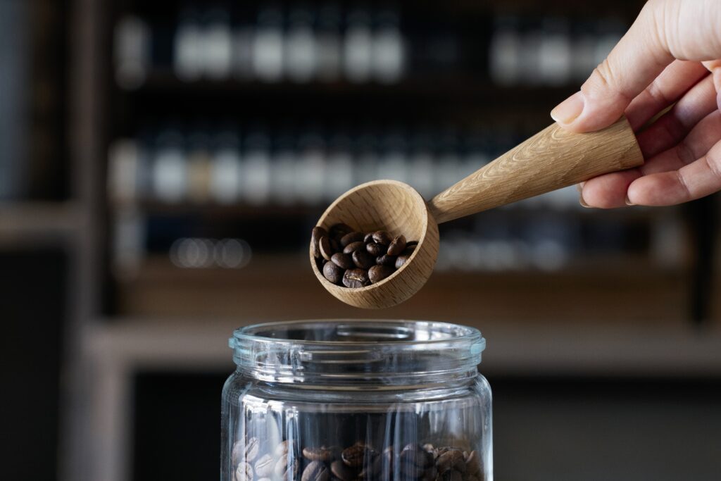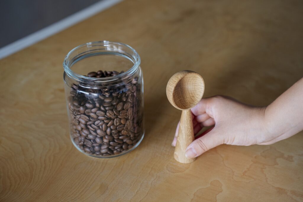 すり切り一杯で約10g(お一人分の豆)を計量でき、使い終わったらそのまま立てて置けるため、カウンターを汚さず、置き場所にも困りません。