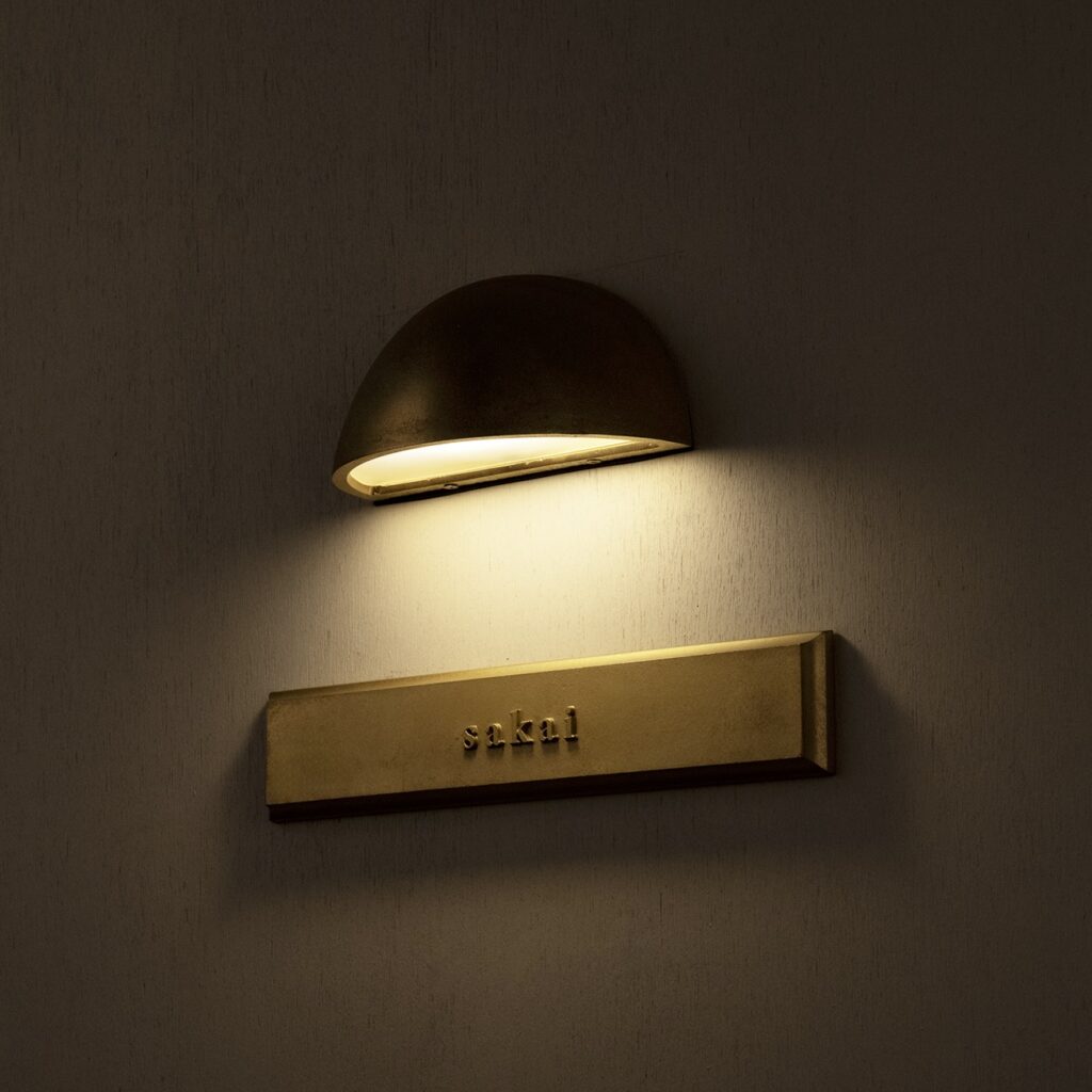 屋外に据えた真鍮は時間とともに酸化し、黄金色から深い琥珀色へとゆっくり熟成します。この“ 経年変化の美しさ” こそネームライトの醍醐味。日中は味わい深いマテリアルとして存在感を放ち、夜間は柔らかな光で表札を浮かび上 がらせ、家の顔を静かに彩ります。