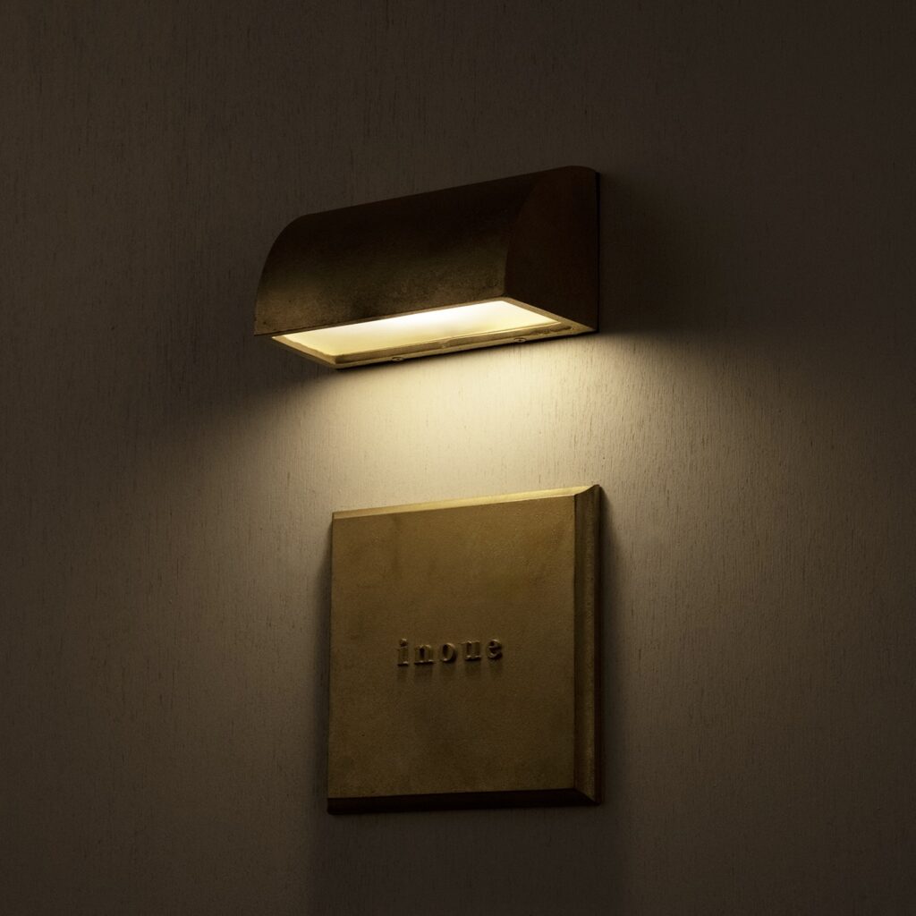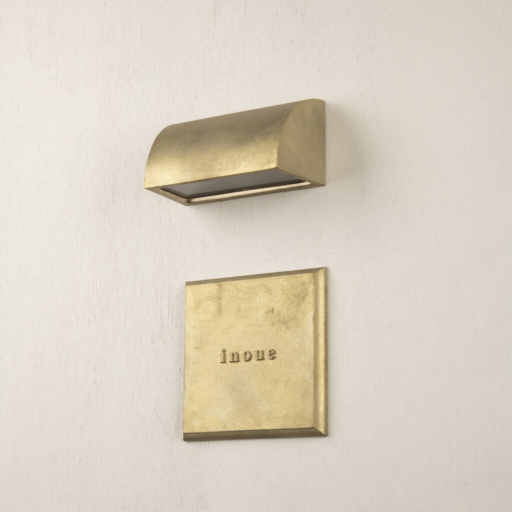 屋外に据えた真鍮は時間とともに酸化し、黄金色から深い琥珀色へとゆっくり熟成します。この“ 経年変化の美しさ” こそネームライトの醍醐味。日中は味わい深いマテリアルとして存在感を放ち、夜間は柔らかな光で表札を浮かび上 がらせ、家の顔を静かに彩ります。