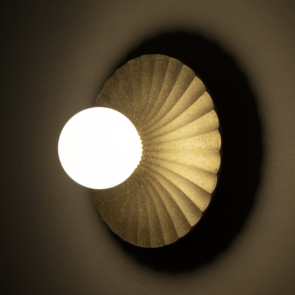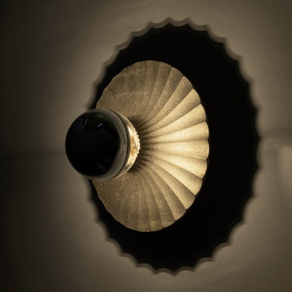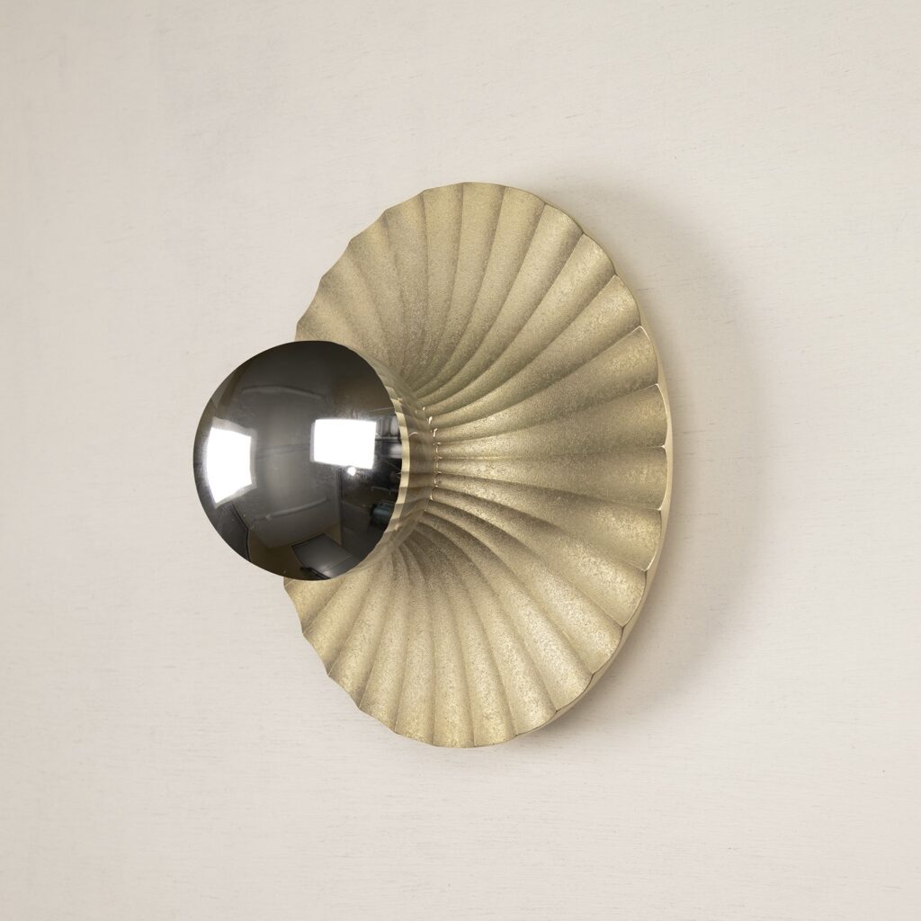 インテリアでは、ソファサイドに淡い光を添えてリビング全体を上質な寛ぎ空 間へ昇華させたり、廊下やベッドサイドでナイトライトとして“ 点の光” を加え たい場面で重宝します。放射状に広がる真鍮反射板〈フレア・ウォール仕様〉 は光を印象的に拡散し、壁面に華やかな陰影を描き出して空間をドラマ ティックに彩ります。真鍮の鋳肌は時とともに琥珀色へと熟成し、光と影 の移ろいを静かに映し出す一灯です。